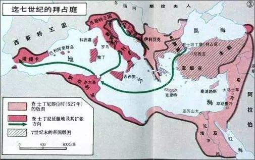 东罗马帝国的都城君士坦丁堡,是在希腊古城拜占庭的基础上建立起来的,起初其疆域包括巴尔干半岛、小亚细亚、叙利亚、巴勒斯坦、埃及、美索不达米亚及外高加索的一部分。到了皇帝查士丁尼在位时,又将北非以西、意大利和西班牙的东南并入版图。554年,击败法兰克王国,拜占廷帝国的国力达到顶峰。