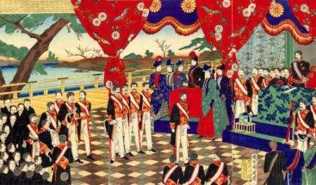 在政治方面,建立中央集权天皇制封建国家,废除贵族世袭制,以才选官。新政权建立不久,为树立了中央集权的指导思想,天皇在大槻树下召集群臣盟誓,“天覆地载,帝道唯一”。