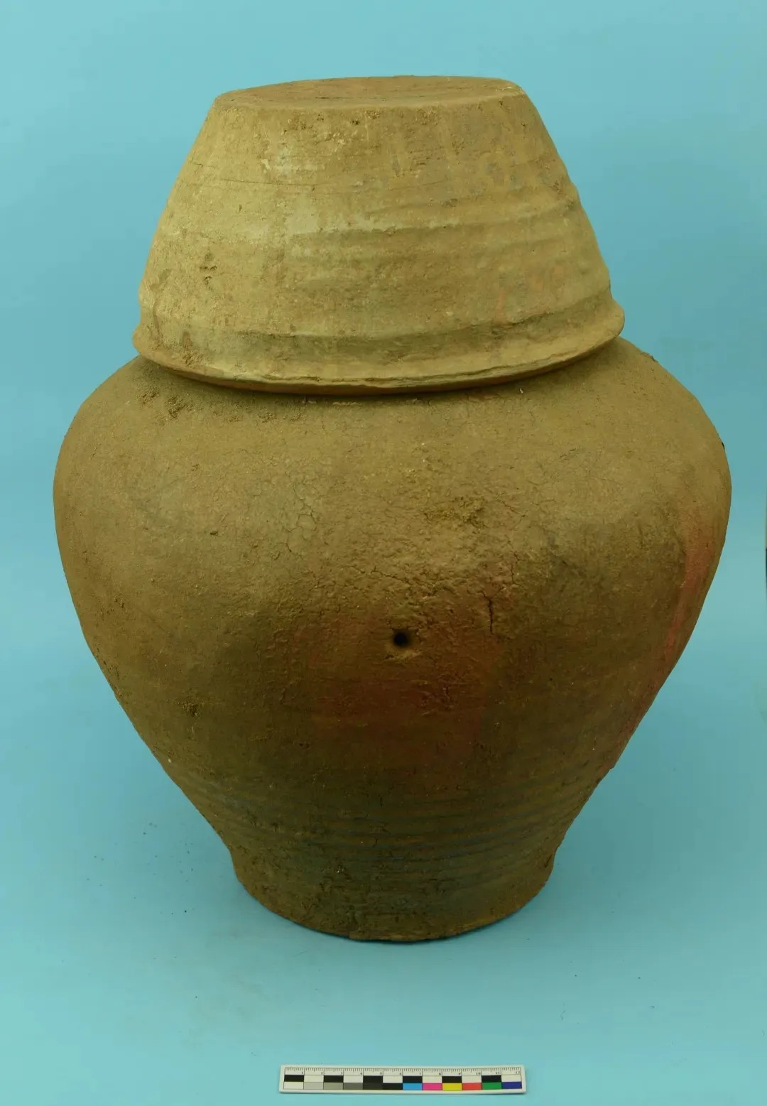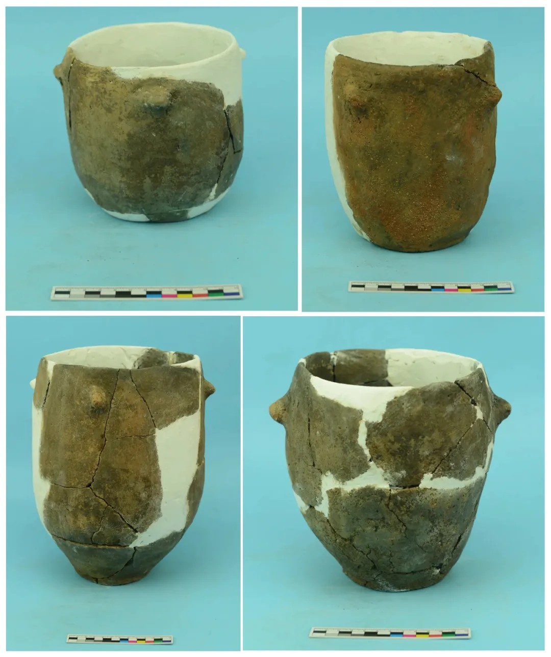 从上至下、从左至右依次为乳钉钮陶罐(F1:1、F1:2、F1:3、F2:1)—汉魏时期