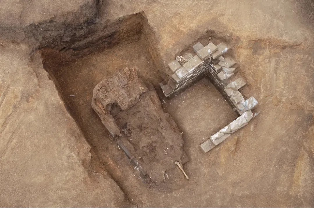M3,土坑竖穴墓,平面呈长方向,东西残长1.90、南北宽1.70米。墓底为平地,在墓葬中央位置放置砖块,在砖块上放置木棺,木棺南北宽0.9、东西残长1.5米。