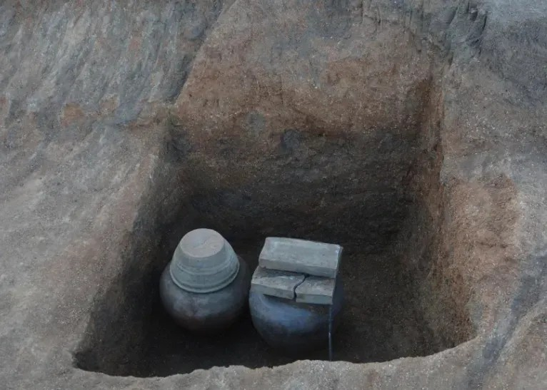 M4,土坑竖穴墓,南北长1.20、东西宽1.10米。墓室中南部出土两个釉陶瓮棺,南侧瓮顶部用一口朝下的青色釉陶罐封口,北侧有陶瓮顶部为三块青砖封口。两个瓮中部各有一处圆孔,圆孔高度和方向一致,均在瓮腹中上部、指向东方。
