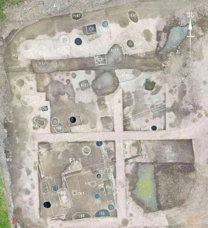 宋元时期遗迹主要由窑炉、灰坑、贮泥池、辘轳坑及水井等共同组成,均开口于③层下,相关文化层堆积厚度约0.35米左右,夹杂较密集的红烧土颗粒、烧土块和碎砖。遗物主要为陶礼(祭)器、陶塑、日用器及陶范等窑业产品,质地以泥质红陶为主,大件陶器多为灰陶或黑陶制品,伴出瓷器多见龙泉窑、景德镇窑及吉州窑之产品残片。现已发现宋元时期窑炉5座,均为小型窑炉,皆营筑于发掘区西侧的黄土岗上,并呈L形分布,部分遗迹向西侧延伸。