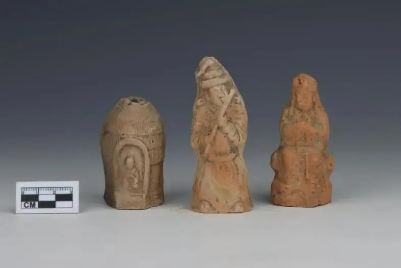 已清理的窑炉(Y14)是一座小型马蹄形馒头窑(图2),窑门位于西北向,火膛呈长方形,因年代久远,窑体上部结构已坍塌。Y14残长1.20、残宽0.70、残高0.10米。炉壁为长条形香糕砖平砌而成,窑內堆积以草木灰为主,夹杂大量红烧土颗粒及烧土块,窑壁及窑床还残存少量的烧结面。较为重要的是,在清理火膛及窑室之间的位置时,出土了3件陶塑(图3),在窑室内还出土了2件陶筹。陶塑可辨造型有仙人、胡人及塔式建筑(图4)。该窑炉与1999年杭州老虎洞窑址东侧发现的南宋礼器局窑炉[1],其造型、规模和砌筑形式均基本一致。