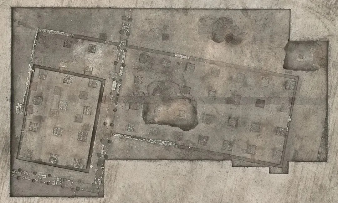台基上共发现44个磉墩,依次编号为TJ1SD1~SD44。其中,TJ1SD19、TJ1SD22、TJ1SD23被H1打破,仅残存磉墩底部一小部分;TJ1SD35、TJ1SD36、TJ1SD39、TJ1SD40、TJ1SD43、TJ1SD44叠压于晚期建筑址夯土层下;剩余磉墩的顶部随建筑地面被一并破坏后,露出其开口平面。磉墩排列有序,东西向十一排,南北向四列,各磉墩之间基本等距分布。磉墩平面均略呈方形,边长1.4~1.6米。从磉墩排列上看,台基整体为十开间三进深的格局,共三十间。以磉墩中心点测,每间南北约4、东西约3.7米。台基受破坏较大,台基现残存面已基本和周围活动面齐平。推测台基东侧应该存在踏道,但已被破坏殆尽。台基周边未见倒塌砖瓦堆积,此现象应和晚期建筑址的营建有关。在1号建筑台基址(TJ1)的中部,被一不规则的晚期H1打破,部分夯土和磉墩均被破坏。2号建筑台基址叠压于1号台基址的东南部之上,编号为TJ2。TJ2平面呈长方形,东西长14.3、南北宽10.7米、残存最高处0.45米。台基外侧为包砖墙基槽,宽约0.45米,基槽内包砖几乎无存。