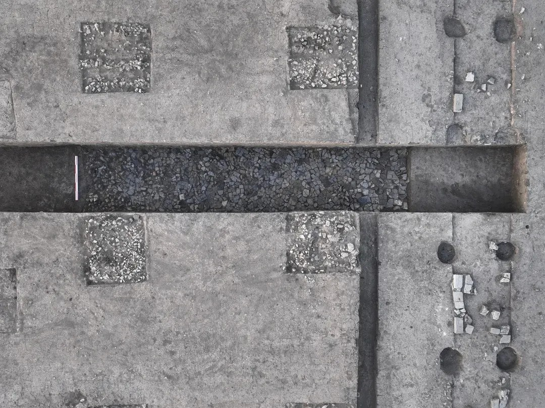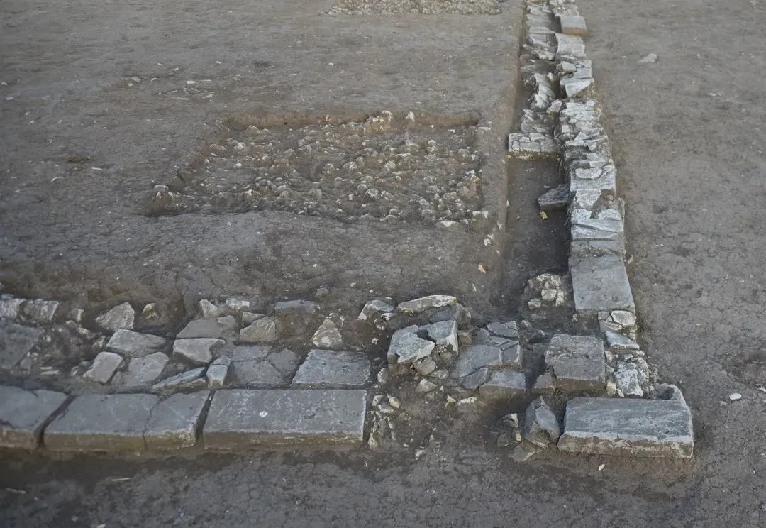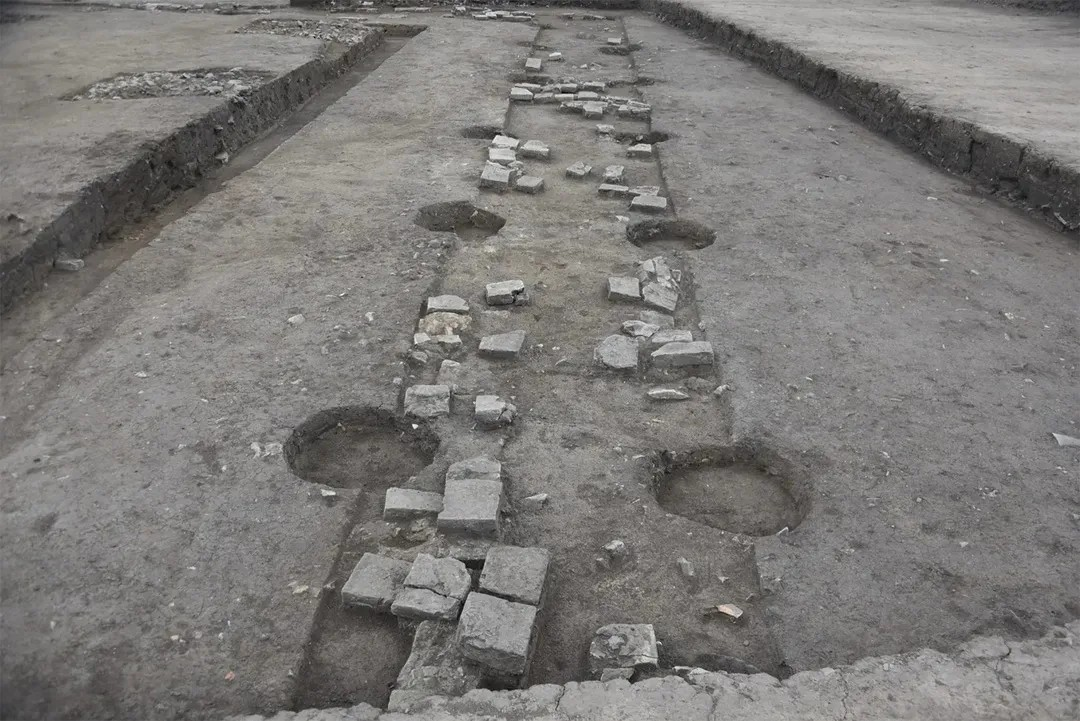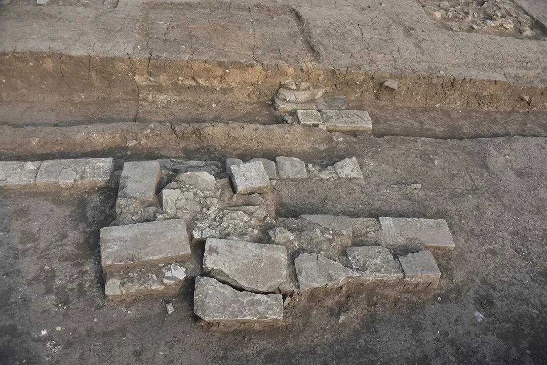 在1号建筑台基址(TJ1)的北侧,清理出一条东西向的道路遗迹(编号L1)。L1已揭露部分东西长约7.9、南北最宽处约1.45米,同TJ1夯土台直线距离约5.7米。此路由单层长方形砖顺向立砌而成,路面受损严重。从L1所处位置及开口层位推测,此路应与TJ1同期。