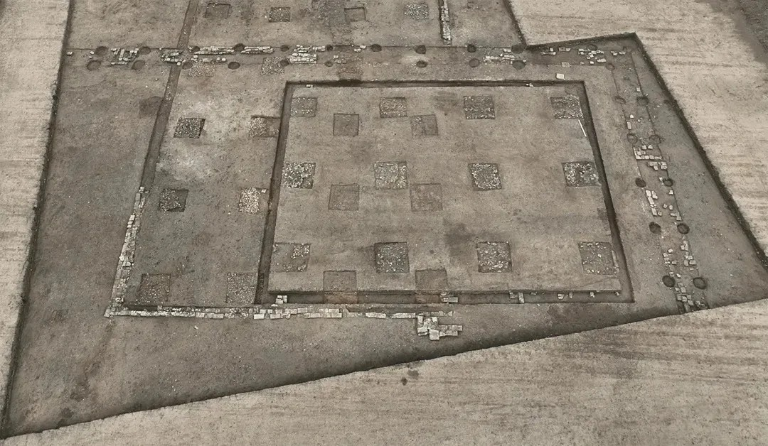 在2号建筑台基址(TJ2)的北、东两面清理出其附属的围墙设施,北、东墙分别向西、向南延伸至发掘区外,未做完整揭露。北墙东段发掘长度为30.5米,东墙北段发掘长度为14.5米。围墙与2号台基平行砌筑,北、东墙分别与台基间隔1.75、2.2米。两段围墙仅存少量基础部分,墙体宽1.2~1.28米,由长方形砖混合夯土砌筑,长方形砖多为顺向铺筑。墙基两侧边缘每隔一段距离就有一个近圆形取础坑或方形小础石,其中小础石表面中间均有一圆窝。揭露的墙基部分共发现取础坑32个、小础石3个。从取础坑和础石的位置可知,墙内外两侧有对称分布的立柱,立柱半包于墙体内,立柱下有础石基础,立柱中心间距为2.3~2.6米。从围墙残存的墙基来看,北墙保存状况较东墙稍好,东墙墙基仅存1层青砖,北墙墙基残存1~3层青砖,且北墙墙基残存青砖呈向北坍塌状。围墙北侧为大量的倒塌砖瓦堆积,倒塌堆积内的垒脊瓦散布位置有一定的规律性,大致呈东西向条带状分布,基本平行于北墙。由此推断,此区域倒塌砖瓦堆积应为北墙向北坍塌形成,且围墙为带脊围墙。