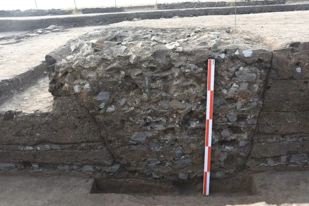 TJ2附属院落围墙设施基础的构筑方法同TJ2一致,东墙于活动面上始建基槽,基槽宽约1.6、深约1.55米,自下而上以一层夯土、一层砖瓦交替夯筑,各有2层,每层厚约0.05米。铺垫完砖瓦后继续填土夯至活动面。北墙于活动面和TJ1残存夯土面上掘土成槽,北墙基槽对墙体范围内的TJ1磉墩进行了避让利用,基槽内夯土中铺垫两层砖瓦层。北墙基槽宽1.85、深约0.7米。